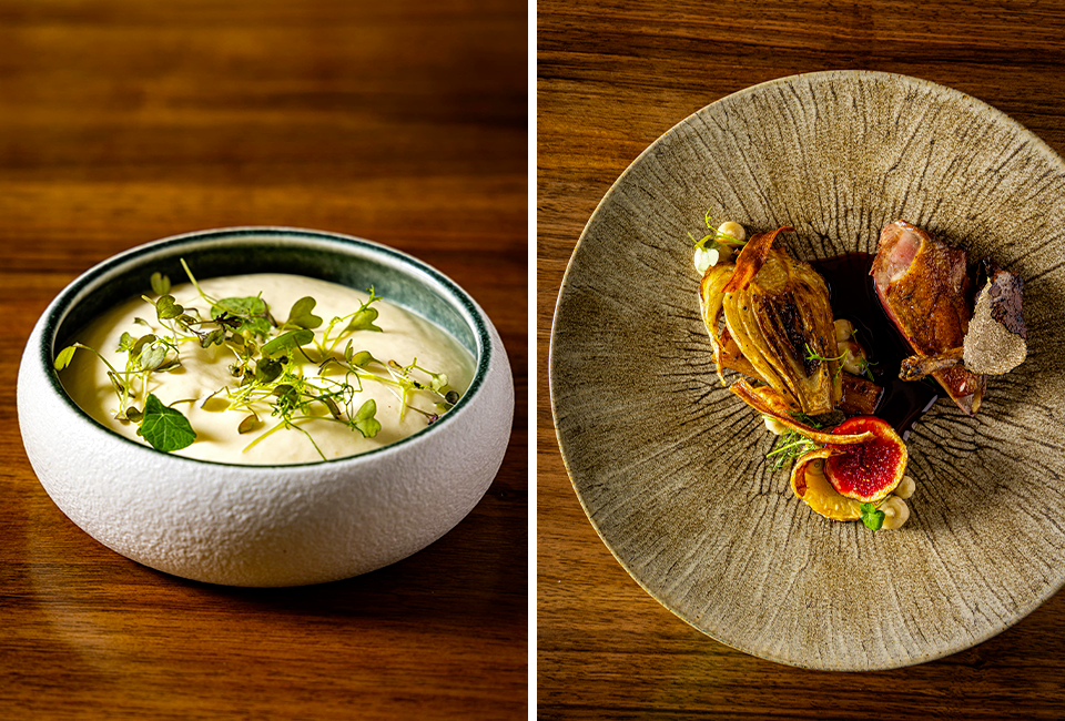Pensée pour refléter l’identité du restaurant Mouchard et de tout le territoire jurassien, la carte du Castel Damandre évolue chaque mois. Produits bio, légumes oubliés, viandes d’exception, alternatives végétariennes… chaque assiette est 100 % maison. Au menu : le Menu des Envies (59 €), le Menu Castel (89 €) et des créations inspirées des montagnes environnantes, des cascades du village et des producteurs passionnés qui nous accompagnent depuis des années.